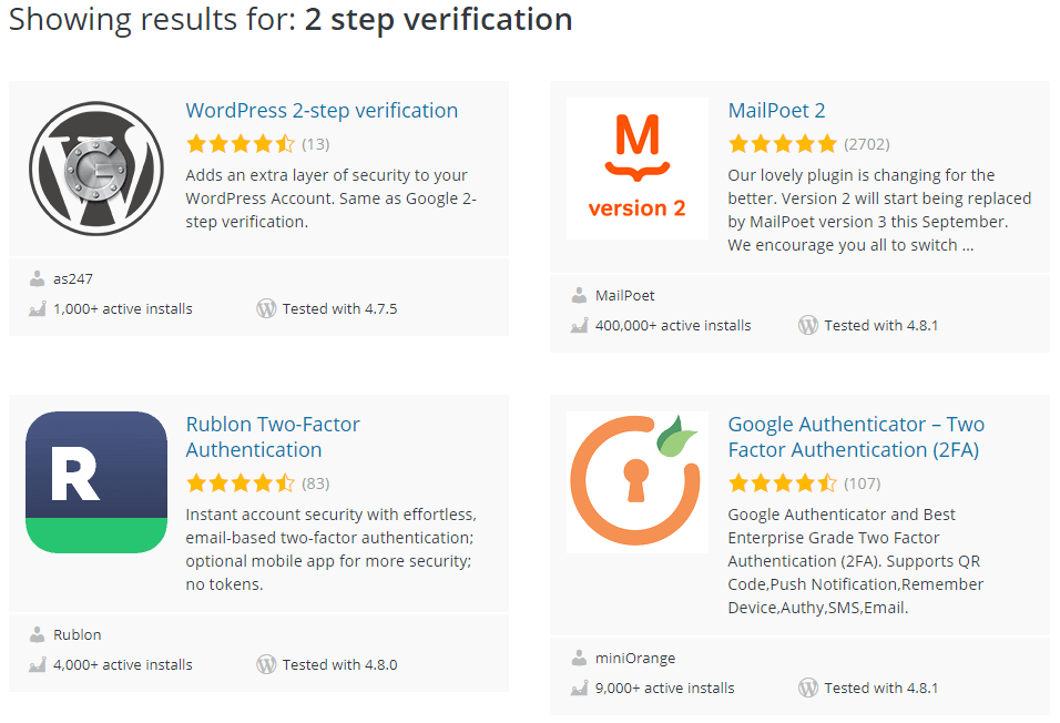 非常简单,安装两步验证的插件,而且还有很多插件可供选择。在wordpress网站上以“2 step verification” 或 “ Two Factor Authentication” 为关键字搜下插件,每个都能找到上百个相关插件。