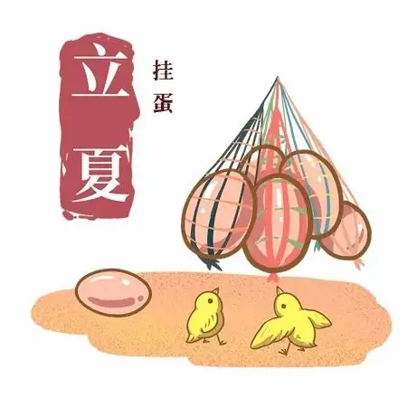 - 立夏吃鸡蛋,石头能踩烂。江浙一带更有立夏吃蛋、挂蛋、斗蛋等风俗。家长们提前煮好的咸鸭蛋,用彩线把鸡蛋编成蛋套,挂在孩子胸前祈求安康。孩子们聚在一起“斗蛋”,看谁的蛋壳最坚硬。