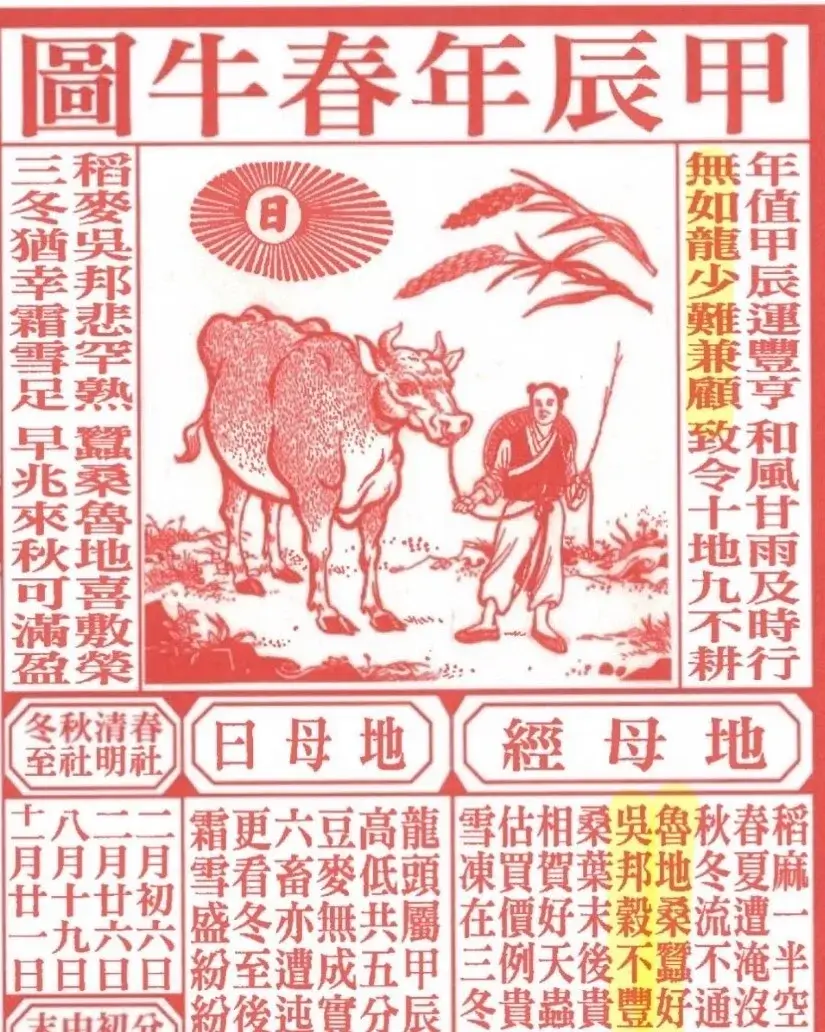- 在春牛图中,除了画有一头牛、以及一个牵牛的牧童之外,左右两旁分别配有七言诗句,通常是预测当年的天气和收成。而春牛图中的牧童,古时又称 “芒神” 或 “句芒神”,画中芒神的年纪、装束、站位,都有对天气、降雨量、收成的预兆。