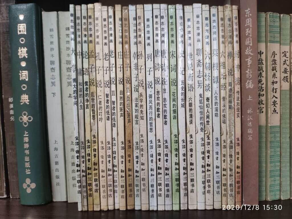 我看的是1990-1991年的三联书店出版的那套。据我所知这一版是最全的,右翻形式和古典内容相得益彰,合计22本。当时有几本书中曾说还将陆续推出另外几本如:《吕氏春秋》、《礼记》、《墨子说》、《战国策》。但经查询豆瓣和中国图书馆联盟,可以确定的是没有,目前三联书店的蔡志忠漫画就是这22本。只有一本相同样式的《封神榜》。不过封神榜里以笑话为主啦。