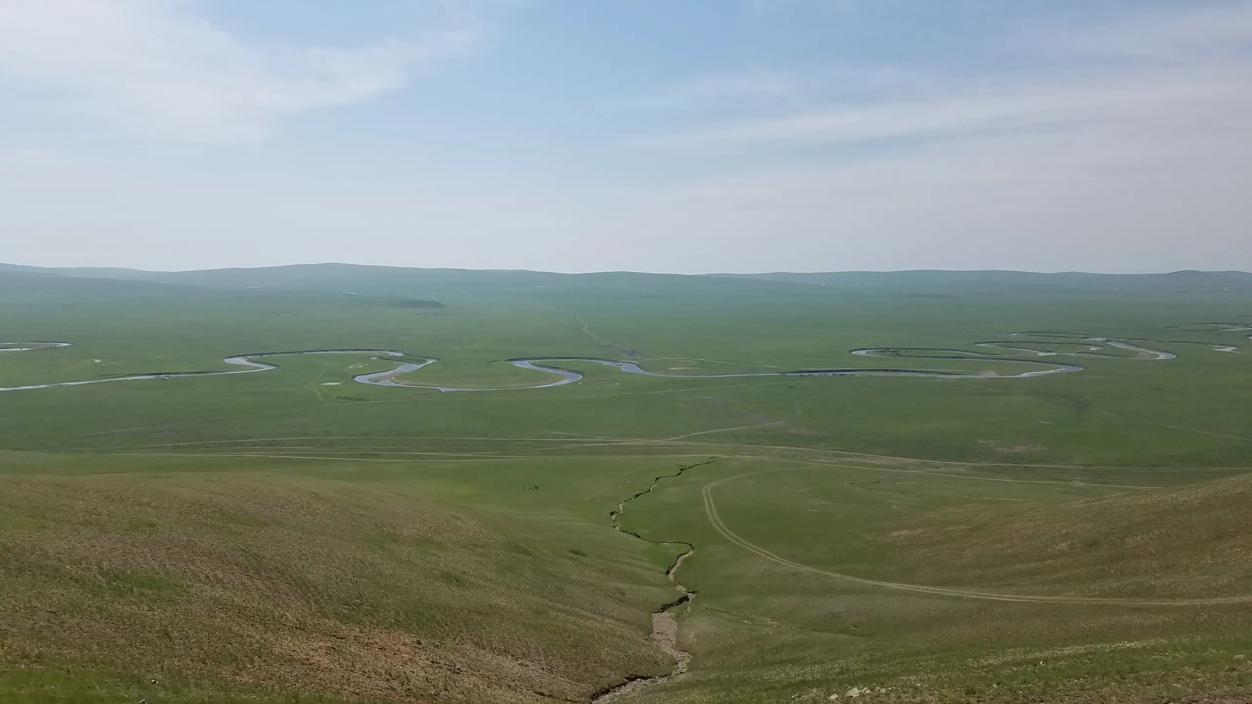 早上,包车从海拉尔市区接我们出发。上午10点进入草原,10点18分到了莫日格勒河观景台,也就是常说的“第一曲水”制高点。 站在高处往下看,草原上的河道不是平平地流过去,而是弯成很夸张的曲线,一圈一圈把视线往远处带。呼伦贝尔最经典的开场,差不多就是这种感觉:天很高,地很开,风景不是一下子扑过来,而是慢慢铺开。