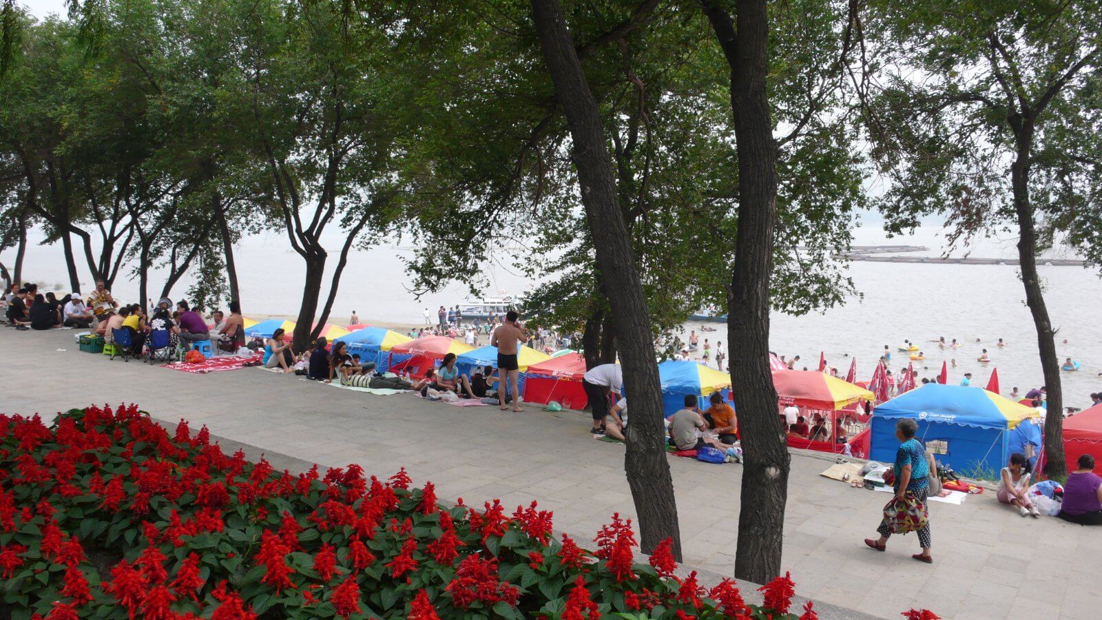 今天是星期天,有很多哈尔滨市民在太阳岛野营。码头那里人很多,小朋友在江边堆沙,大人在帐篷或塑料布上吃着香肠喝着啤酒,很是热闹。花30元买票进入太阳岛公园。公园很大,里面的人却比外面少多了。这里和上海世纪公园有点像,很多人都租了2人或3人自行车在骑。公园风景不错,不过也没什么特别的。下午2点钟,天阴了下来,我正在晒日台,听旁边的导游说太阳岛是被后羿射下的太阳落下形成的。下午2:30天开始下雨了,这是8天里我头一次遇到下雨。大概是告诉我旅行要结束了。