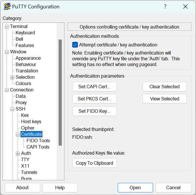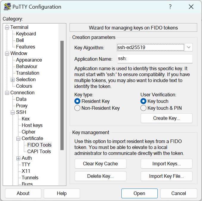 - 打开Putty CAC,进入connection->SSH->Certificate->FIDO Tools