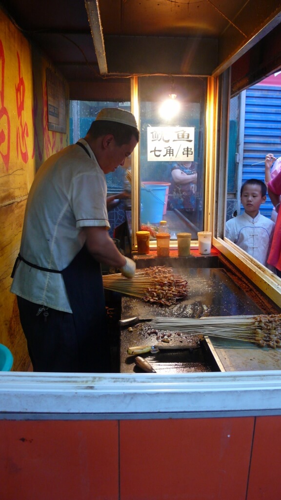 晚饭是在莫家街解决的,尝了不少西宁的特色小吃。酸奶,甜醅,羊肉串,擀面皮… 酸奶很好吃,甜醅很有特色但不太和我的口味,我最喜欢的居然是莫家街上的烤鱿鱼。明知这不会是青海特色,可想到网上很多人推荐就尝了一下。咖喱味的鱿鱼真的很特别,我吃了20串。
