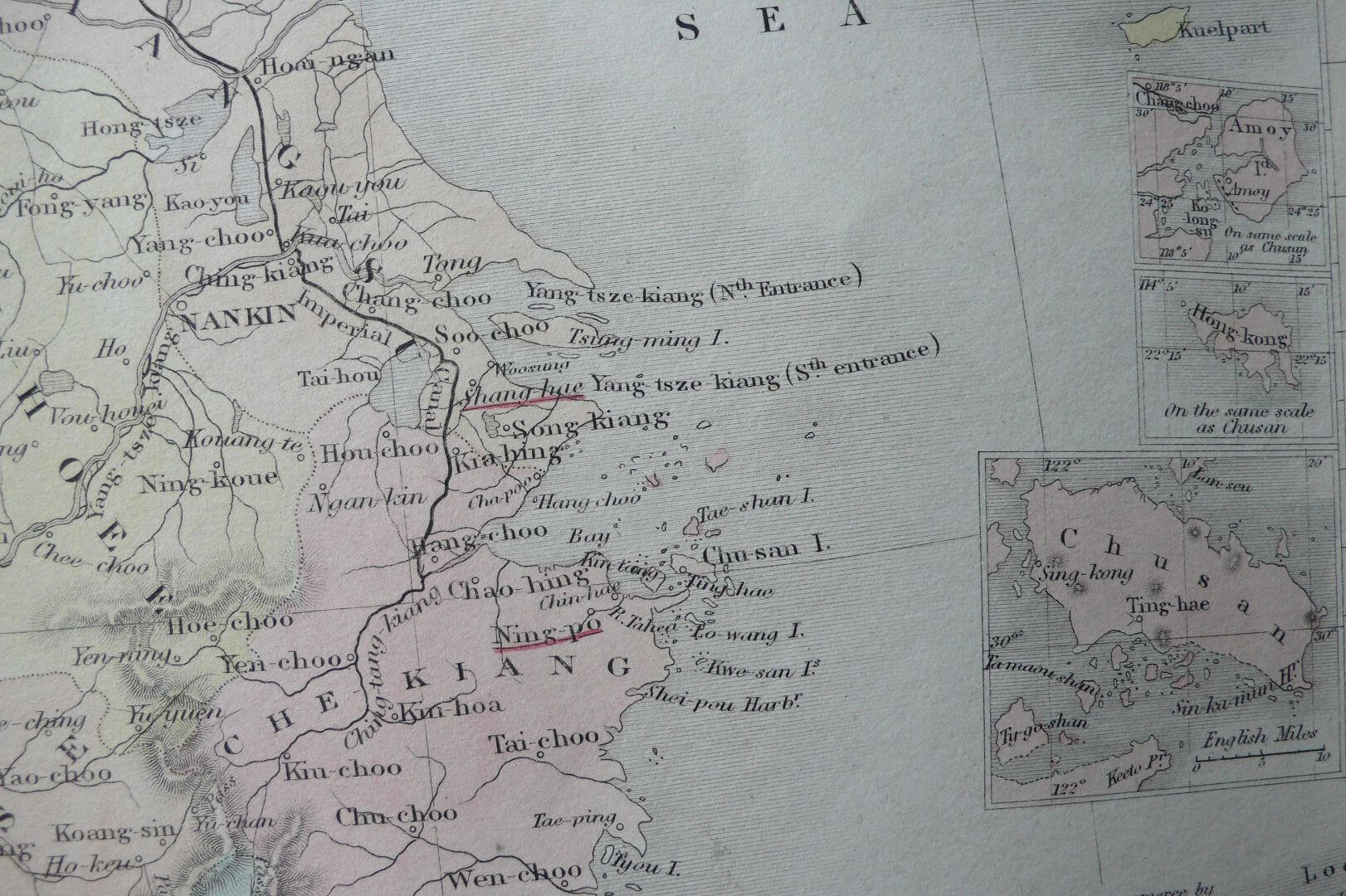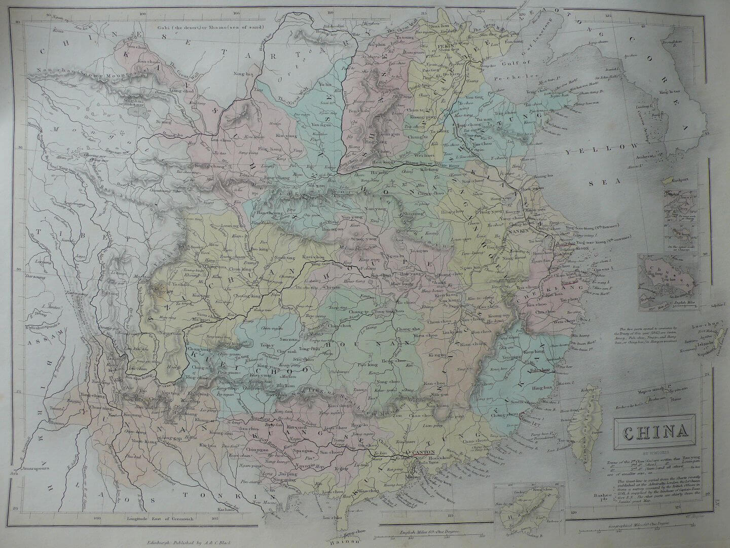 这是一张1851年由威廉·休斯亚当和查尔斯布莱克发布于爱丁堡的钢刻古董地图。该地图最初发表于1842年,显示了极佳的中国地图细节。上面清晰标示了城市,城镇,河流,山脉,海湾等细节,还标注了当时中国与欧洲通商的五个口岸,并有厦门,舟山,香港和海南岛的插图。地图尺寸约为43厘米×30厘米(17英寸×12英寸),保存的很好。